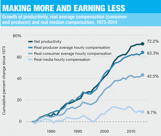 To analyze the long-term shift in the economy and what it means for workers today, researchers at the Economic Policy Institute compared the measure of productivity from 1973 to 2014 with various calculations of wages and salaries: average hourly compensation, which averages everyone's paycheck, from CEOs to fast-food workers; and median hourly compensation, the pay for the person at the exact middle of the American income ladder. (See the "Making More and Earning Less" graph below.)