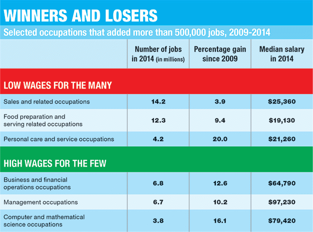Comparing the latest data from May 2014 and the numbers from May 2009--the month before the Great Recession officially ended--the greatest absolute number of jobs created during those five years--about 1 million in all--fell into the "food preparation and service-related occupations" group, where the median annual salary in 2014 was just over $19,000. (See the "Winners and Losers" table below.)